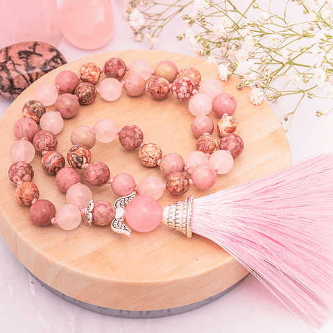 Contador de Códigos Sagrados Corazón Abierto de 45 cuentas delicadamente hecho a mano, ideal para llamar la gracia de los Angeles. Elaborado con Cuarzo Rosa, Rodonita y Jaspe 100% natural.