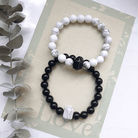 Dúo de Brazalete Parejas en Ónix y Howlita en piedras 100% naturales. Demuestra el amor a tu pareja con este lindo detalle.